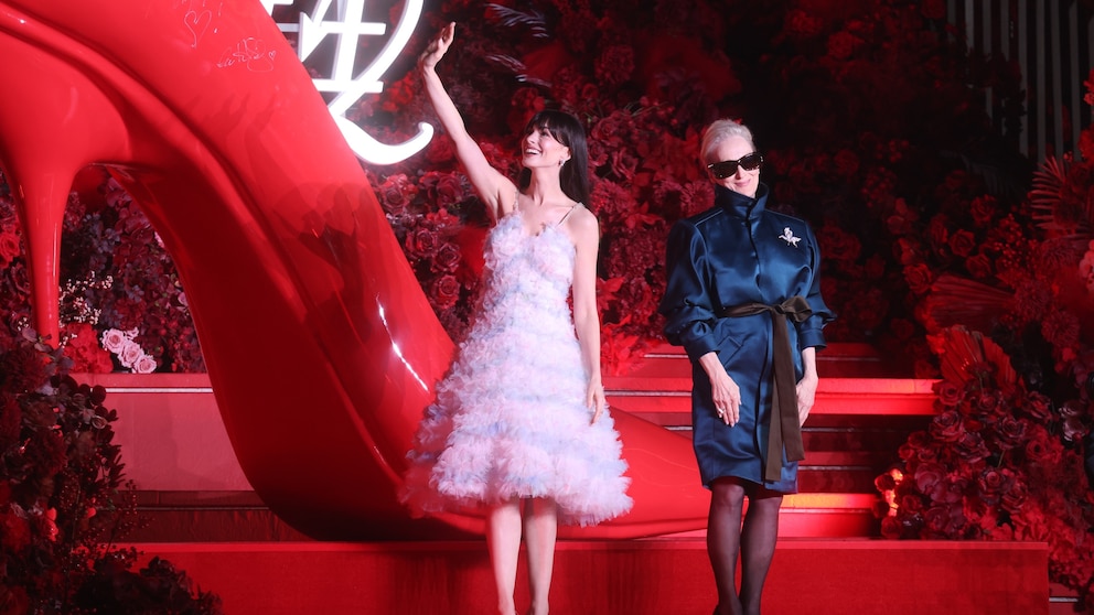 For the red carpet at Roppongi Hills Arena in Tokyo, Hathaway wore a strapless Valentino dress styled by Walsh, while Streep opted for a red Chanel two-piece fringed set styled by Erlanger.
