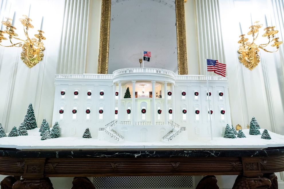 Also among the decorations is also the 2025 Gingerbread House. The creation weighs in at over 120 pounds, according to the White House, and is on display in the White House State Dining Room.