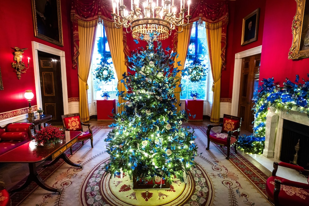 This year's decorations follow a red, white and blue theme. In the White House Red Room, blue butterflies adorn a Christmas tree alongside white ribbons reading "fostering the future" and white ornaments printed with the words "Be Best," the first lady's public-awareness campaign.