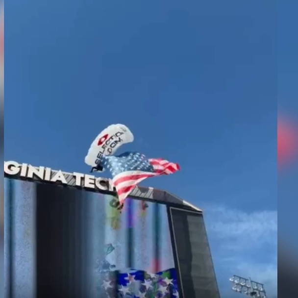 Virginia Tech confirmed the incident in a statement Saturday, saying, "One of three parachutists was blown off course and got stuck on our stadium scoreboard."