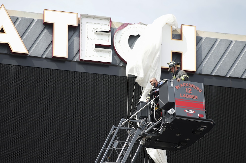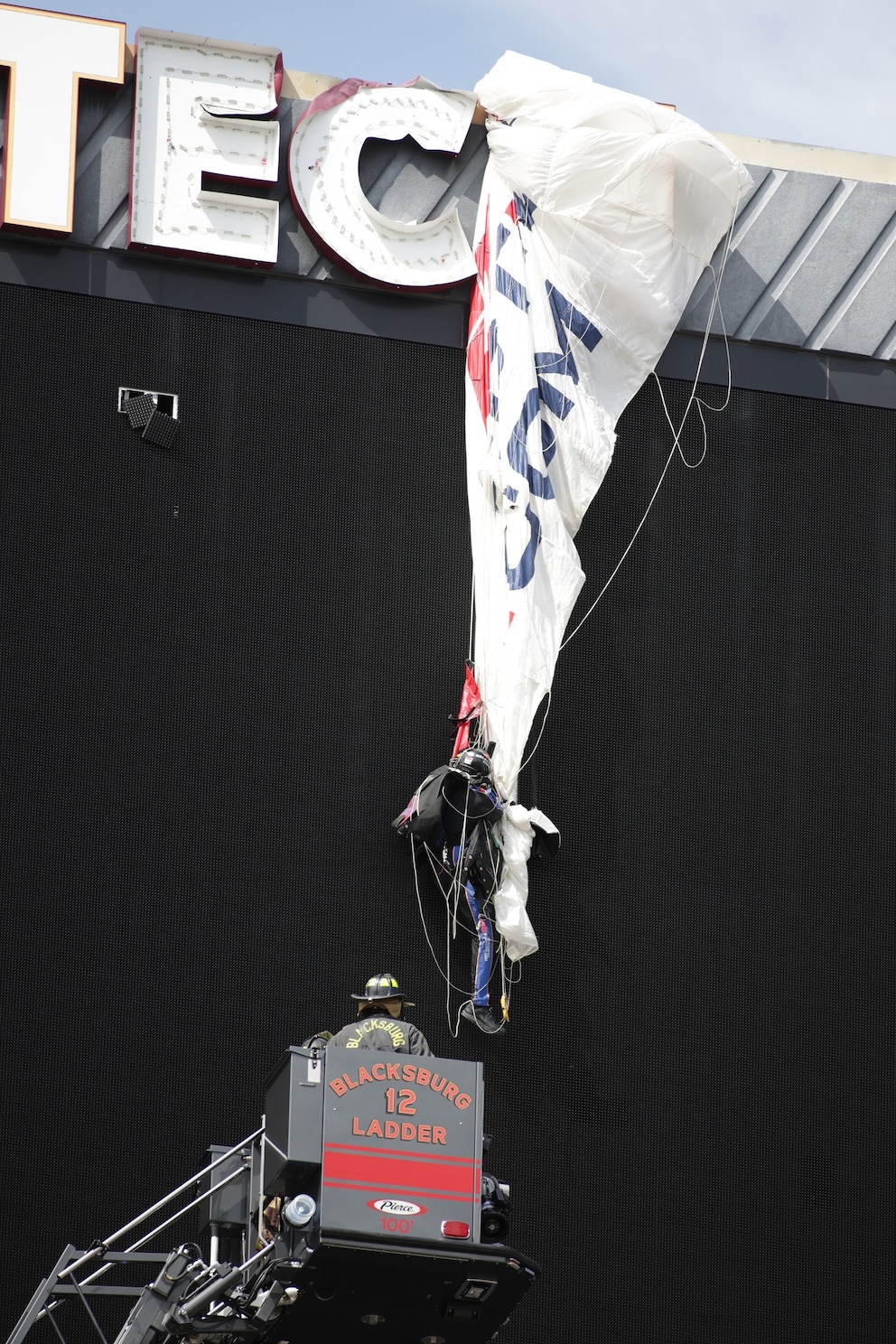 Blacksburg Volunteer Fire Department rescue a skydiver who crashed into the scoreboard at Lane Stadium in Blacksburg, VA on April 18, 2026.